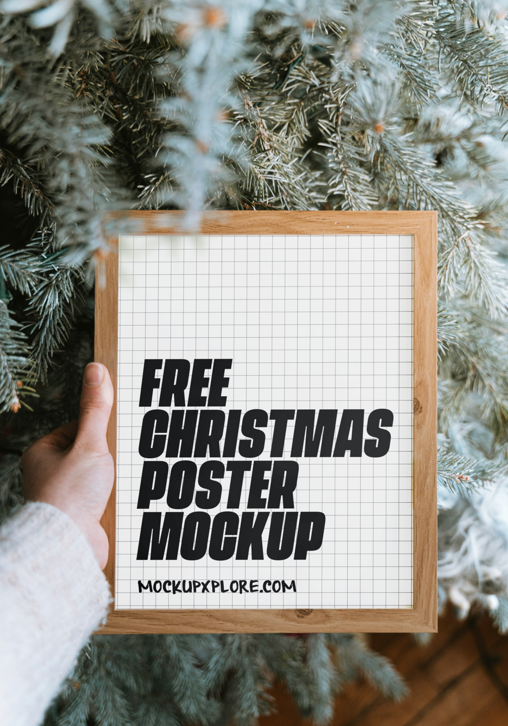 Step into the holiday spirit with our Christmas-themed Frame Mockup, beautifully held in a woman's hand against the enchanting backdrop of a Christmas tree. This mockup features an oak wood-colored frame, adding a warm, natural touch to your festive designs. The light, whitish tones of the background amplify the serene and cozy Christmas atmosphere, making your artwork pop with joy and festivity.